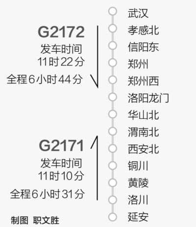 武汉铁路部门相关负责人告诉记者,今年6月,西十高铁开通后,武汉至延安就可以直接走汉十高铁和西十高铁,然后转西延高铁,整个行程只需要3个半小时,“武汉距离延安越来越近了”。