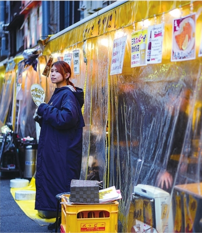 1月20日,餐厅工作人员在日本东京浅草寺附近招揽生意。