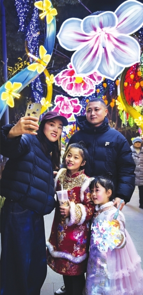 市民游客在园博园内赏灯拍照。