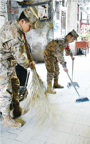 “雷锋梯队”队员在盲人宿舍区打扫卫生。