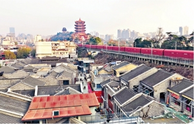 置身这条长约500米的街巷,演艺、游乐、餐饮、文创等业态分布其间,人们的视线总能与黄鹤楼相遇。