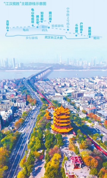 “江汉揽胜”主题游线依托长江大桥与长江黄金水道,串联黄鹤楼景区与知音文化旅游区,集“亭(拂云亭)、台(古琴台)、楼(黄鹤楼)、阁(晴川阁)、殿(知音殿)”五种传统建筑形制于一体,形成五“古”丰登、水陆贯通、古今对话的游览体验。