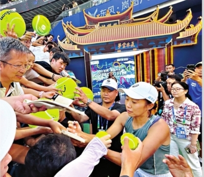 2025武汉网球公开赛赛后,张帅与球迷签名互动。