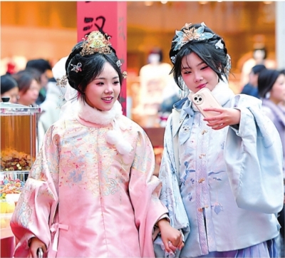 刚放寒假的“10后”朱思扬和李思怡穿着传统服饰逛江汉路。