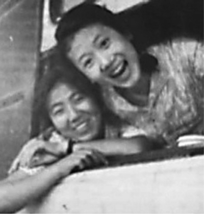作者郑忆石(右)第1次乘火车,乐开了花。