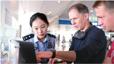 武汉边检站民警指导天河机场外籍旅客线上填报外国人入境卡。