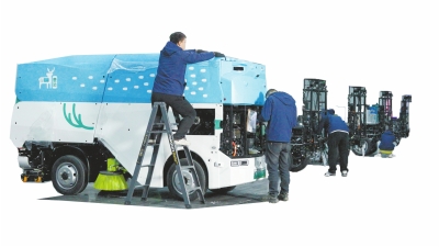 工作人员正在调试无人驾驶洗扫机器人“鹿呦”。
