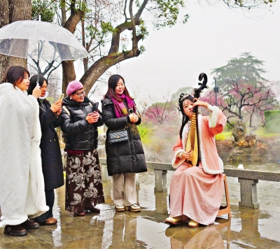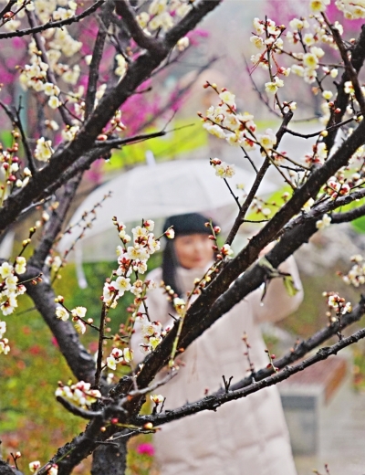 当天,一枝春馆中三场古风沉浸式演绎轮番上演,演员们化身历史人物带来“青梅煮酒”“梅兰竹菊四君子”和“太白梦梅”三场演出,与游客近距离互动。游客王先生撑着伞边赏花边说:“在细雨中赏梅别有一番韵味,这种能让历史人物‘走出来’和你聊天的演出更是惊艳,这种沉浸式的体验让梅花精神和传统文化真正活了起来。”