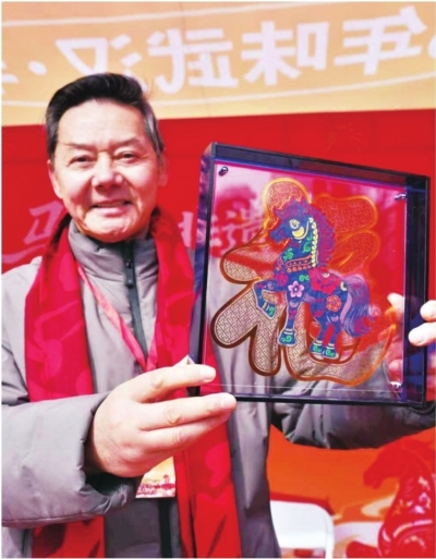 在咸安坊非遗大集上,“武汉剪纸”非遗代表性传承人沈松柏展示剪纸作品“马到福来”。
