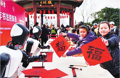 在黄鹤楼公园2026年书法迎新春活动现场,远游人形机器人与小学生同台竞技写“福”字。