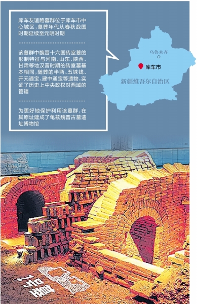 龟兹魏晋古墓遗址博物馆内的友谊路墓群砖室墓。