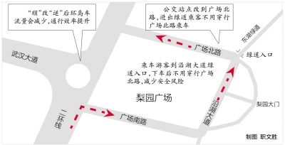 市公安局东湖风景区分局交通管理大队秘书科科长项琛介绍,梨园广场的“顺时针”单向通行方案从2015年启用,随着地铁8号线通车、梨园广场综合体投用以及游客总量的激增,现有的道路交通条件不能承受客流高峰期人流和车流,实际运行中交管部门不得不根据流量实时管控调整。