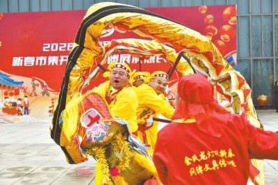 2月10日,新洲区“迎新春 赏非遗”新春市集开市,逛、吃、购、游、玩一站式汇聚,近万市民前来逛大集、赏非遗、品美食,年味浓郁,锣鼓声、欢笑声交织成热闹的新春乐章。图为金龙闹春表演。