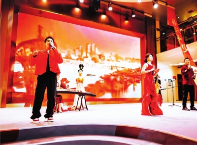 一楼多功能大厅内,手持惊堂木的说书人声如洪钟,一段《汉腔说书》说到酣处,引发游客畅快笑声;编钟与古筝交织,《江城魂》悠扬响起,舞者着楚风长裙翩然起舞,衣袂随着江风与乐声流转。