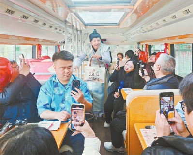 2月13日,“妙遇汉阳”马年新春免费旅游观光巴士专线试运营,伯牙、子期主题快闪在车厢内惊喜上演。