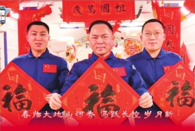 “我们在中国空间站祝大家马年大吉、阖家幸福、喜乐安康。” 马年春节到来之际,神舟二十一号乘组(从左到右)武飞、张陆、张洪章,换上新年限定“战袍”“祥云服”,手拿福字,在中国空间站献上别具一格的新春祝福。