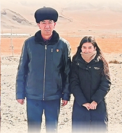 努斯来提·衣马热提(右)和护边员麦麦提努尔大叔合影。