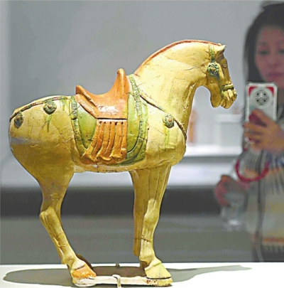 观众在拍摄《三彩马》。 唐(618—907年),1956年武昌何家垅墓地出土。