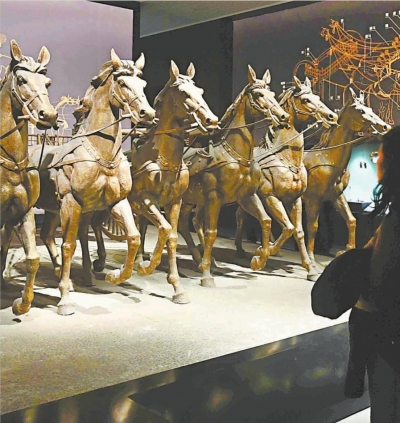 游客在“楚国八百年”展厅参观荆州熊家冢遗址复原的《六驾马车》模型。