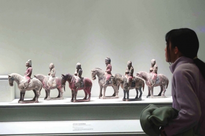 游客在观看《彩绘骑马仪仗陶俑》。 唐(618—907年),1975年湖北省十堰市郧县李泰墓出土。