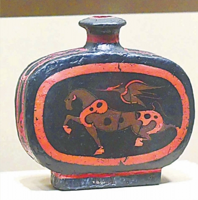 《彩绘牛马鸟纹漆扁壶》。 秦(公元前221年一公元前207年),云梦睡虎地44号墓出土。
