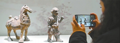 游客在拍摄《彩绘胡人牵马陶俑》。 隋(581-618年),1956年湖北省武汉市武昌何坡山52号墓出土。