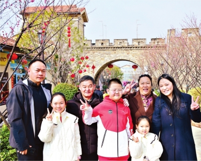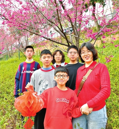 来自陕西榆林的李女士(右一)和亲友在龟山公园赏樱合影。