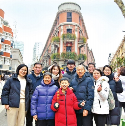 来自江苏南京的孙先生(左四)一家人和同事自驾来汉游玩,他们在江汉关大楼前合影留念。
