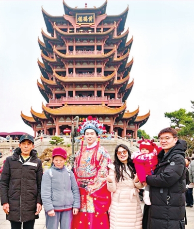 游客与身着古装的工作人员在黄鹤楼前互动打卡,定格新春游园的美好瞬间。
