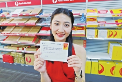 在澳大利亚堪培拉,新华社记者手举写给远方父母的明信片,上面贴有马年邮票。