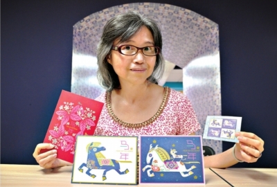 在新加坡邮政总局,设计师林愿玲手举她设计的马年明信片与邮票。