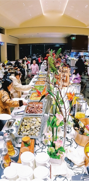 游客在甘露山花间堂·岚雪自助餐厅就餐。