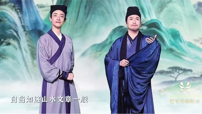节目中,人气颇高的音乐剧演员郑云龙扮演的“徐霞客”在山水之间展开了一场“跨时空”的文化漫游,与韩愈、柳宗元、米芾、王阳明等大家对谈、踏歌。余维刚在节目中扮演“唐宋八大家之首”的韩愈,在四位大家中率先亮相。他不仅和郑云龙有一段对谈,更通过一段风格明快的楚剧唱腔呈现了韩愈“文以载道”的思想。