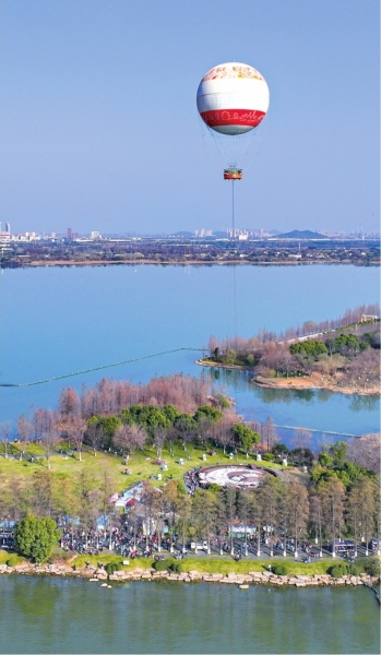 市民游客在东湖绿道骑行跑步、散步休闲、拍照打卡,尽享春日江城的惬意与年味。