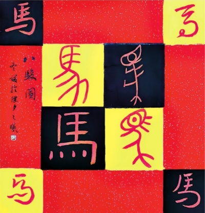 从外向内、顺时针顺序:外圈为行书、草书、简牍、章草;内圈为小篆、甲骨文、金文、隶书。