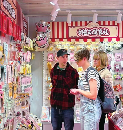 外国游客正在武汉礼物江汉路快闪店选购商品。