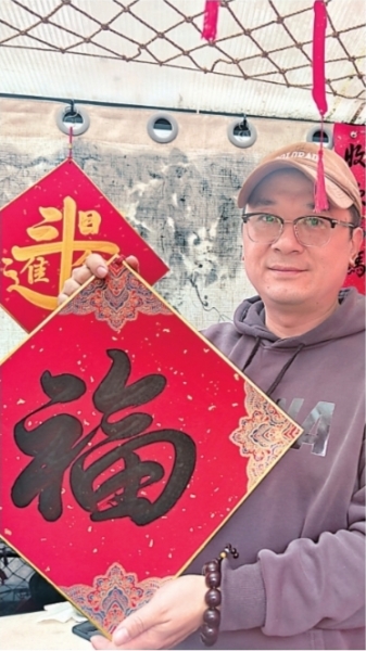 另一边,白慧玲的摊位上除了书法类文创,还摆满了手工编绳。她手指翻飞,给一根红绳编入万字结,再串上写有“平安”“喜乐”的书法挂坠。“春节卖这些手工品很应景,我做得也挺开心的,有时候客人一买就是好几个,都是送亲戚朋友。”她指了指旁边刚编好的几串,“这种祝福语的卖得可好了!”