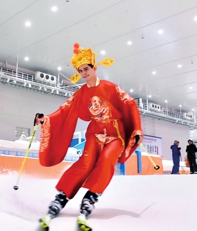 在甘露山国际滑雪场,来自俄罗斯的高颜值“NPC”(非玩家角色)艾力克斯体验“热雪沸腾”。