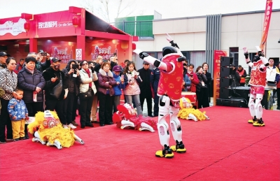 龟山电视塔新春科技庙会上,市民游客观看机器人、机器狗表演。
