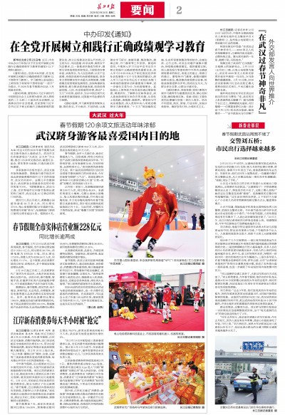 长江日报讯(记者黄丽娟 通讯员武文旅)长达9天的2026年春节假期为武汉文旅市场注入强劲动力。武汉市文化和旅游局以“大武汉 过大年”为主题,推出120余项文旅活动,涵盖灯会、庙会、赏花等多元体验,打造沉浸式年味盛宴。