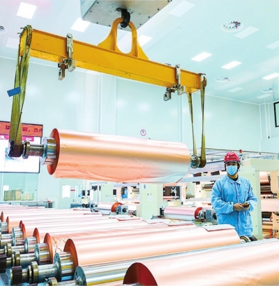 2月24日,黄石诺德锂电铜箔产业园生产车间内,工作人员操作生产铜箔产品。