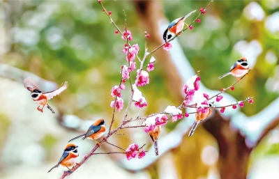 专业评审小组成员、湖北省摄影家协会主席团成员兼副秘书长金思柳表示,武汉市民和广大摄影爱好者参与大众冰雪季梅花主题摄影竞赛的热情很高,参赛作品数量多,巧妙搭配了冰雪景观、城市地标、体育锻炼、赏梅趣事等场景,定格了武汉冬季独有的城市韵味。“一等奖作品《大寒之日,山雀登上红梅枝头》是一组作品,摄影师以敏锐的视觉捕捉拍摄了多只红头长尾山雀栖落红梅枝头的精彩瞬间,寒风中傲雪绽放的红梅,映衬着红头长尾山雀轻盈矫健的身影,虬枝的冷褐、梅瓣的暖绯、雀羽的灰赭,在虚化的灰绿背景中交织成和谐的视觉乐章。镜头既定格了生灵相聚的热烈,也留存了独处的静谧,在动静相生、疏密有致间,铺陈出冬日将尽、春光初萌的细腻诗行,宛如一阕献给早春的视觉俳句。”