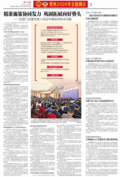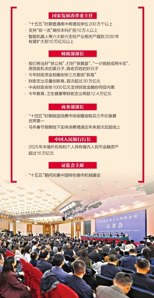 3月6日,十四届全国人大四次会议在北京梅地亚中心新闻发布厅举行记者会。国家发展和改革委员会主任郑栅洁、财政部部长蓝佛安、商务部部长王文涛、中国人民银行行长潘功胜、中国证券监督管理委员会主席吴清就发展改革、财政预算、商务、金融证券等相关问题回答中外记者提问。
