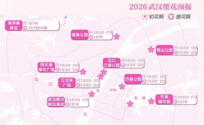 作为全国闻名的赏樱胜地,武汉何时花开最盛?去哪里能邂逅最佳景致?3月9日,武汉市文化和旅游局联合湖北省气象服务中心、武汉市气象局正式发布《2026武汉樱花预报》,这份精确到天、覆盖全市各大热门赏樱点位的权威花期预报,正式宣告武汉进入全城赏樱的“樱花时间”。今年花期预报显示,最具观赏价值的中樱品种将在3月17日左右迎来盛花期。