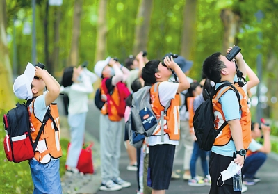 孩子们用望远镜观察大自然。