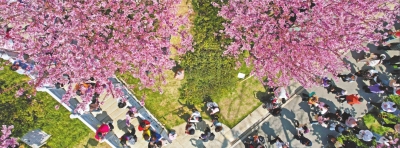 汉阳龟山公园樱花栈道上,粉色早樱迎春盛放,市民游客漫步其间,尽享明媚春光。