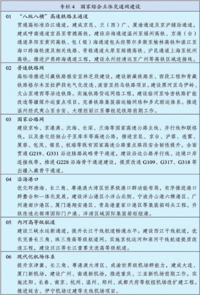 推进补网强链提质,加强跨区域统筹布局、跨方式一体衔接,全面提高交通基础设施综合效益。完善国家综合立体交通网主骨架,高质量建设沿海沿边沿江、出疆入藏、西部陆海新通道等战略骨干通道,基本建成“八纵八横”高速铁路主通道和国家高速公路网,推进内河高等级航道提质升级,基本建成世界级港口群和机场群。强化薄弱地区覆盖和通达保障,推动普速铁路、普通国省道升级改造,开展新一轮农村公路提升行动,加强西部地区铁路和支线机场建设,完善边境地区路网布局。建设国际性、全国性综合交通枢纽城市,加强集疏运网络建设和场站衔接,完善国家邮政快递枢纽。健全多元化、韧性强的国际运输通道体系,推动跨境交通基础设施互联互通,促进国际航空货运健康有序发展。统筹功能提升和绿色安全智能发展,推进交通基础设施更新改造和养护管理,加强安全风险评估和监测预警,实施公路安全韧性提升工程。深化综合交通运输体系改革,推进铁路体制改革和收费公路政策优化。(专栏4)