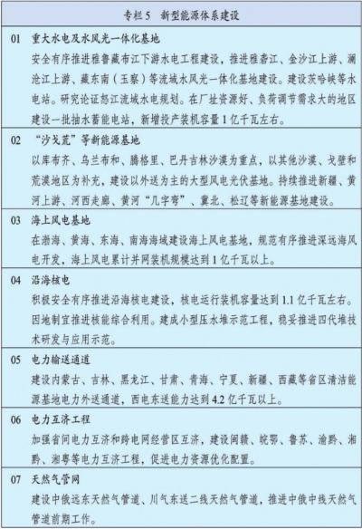 深入实施能源安全新战略,加快构建清洁低碳安全高效的新型能源体系,建设能源强国。推进非化石能源安全可靠有序替代化石能源,坚持风光水核等多能并举,实施非化石能源十年倍增行动。统筹就地消纳和外送,建设“三北”风电光伏、西南水风光一体化、沿海核电、海上风电等清洁能源基地,加强分布式能源就近开发利用,布局发展绿色氢氨醇,积极推进光热发电和地热能利用。加强化石能源清洁高效利用,推进煤电改造升级和散煤替代。着力构建新型电力系统,全面提升电力系统互补互济和安全韧性水平,优化全国电力流向和跨区域通道布局,加快智能电网建设,完善城乡配电网,科学布局抽水蓄能,大力发展新型储能。提高终端用能电气化水平,推动能源消费绿色化低碳化。基本建成全国统一电力市场体系,完善油气“全国一张网”运行调度机制。(专栏5、图1)