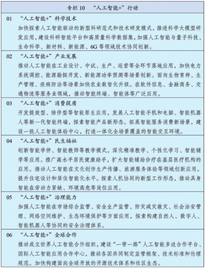 全面实施“人工智能+”行动,加强人工智能同科技创新、产业发展、文化建设、民生保障、社会治理相结合,抢占人工智能产业应用制高点,全方位赋能千行百业。