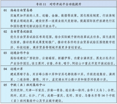 打造形态多样的开放高地,加快形成陆海内外联动、东西双向互济的全面开放格局。高标准建设海南自由贸易港,高水平实施全岛封关运作,持续提升贸易投资和要素流动等重点领域开放水平,逐步构建与高水平自由贸易港相适应的政策制度体系。实施自由贸易试验区提升战略,开展更大力度制度型开放试验,提升创新引领发展能级。统筹布局建设科技创新、服务贸易、产业发展等重大开放合作平台,支持功能相近、区位相邻的平台优化整合,推动国家级新区、开发区管理制度和运营模式创新,促进综合保税区转型升级,推进沿边重点开发开放试验区、产业协作园区、沿边临港产业园区和边(跨)境经济合作区等建设。(专栏11)